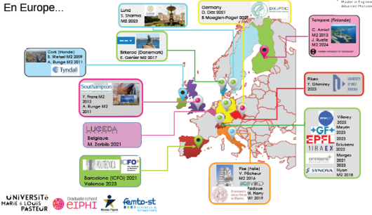 The E-PhoT Master is part of the EIPHI Graduate School at the Marie and Louis Pasteur University in Besançon, supported by the FEMTO-ST Institute, a leading research center known for groundbreaking advancements in photonics, microtechnologies, time-frequency, and advanced materials. The program prepares students for careers in research and development within innovative companies or for academic research through PhD opportunities.
